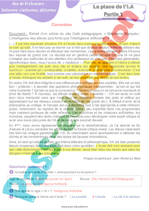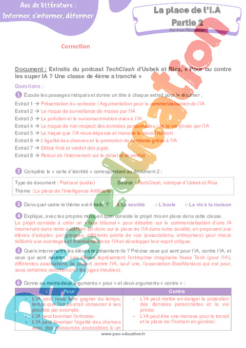 Correction Document de synthèse : 2eme Secondaire La place de l’Intelligence Artificielle pdf
