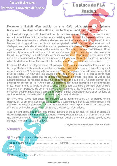 Littérature + Questionnaire : 2eme Secondaire Partie 1 – La place de l’Intelligence Artificielle pdf