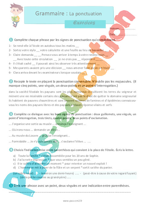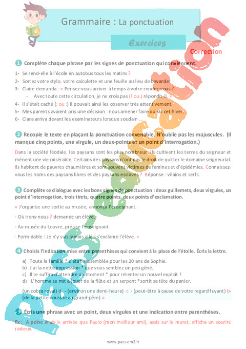 Exercices avec les corrections en grammaire : La ponctuation en 5eme Primaire