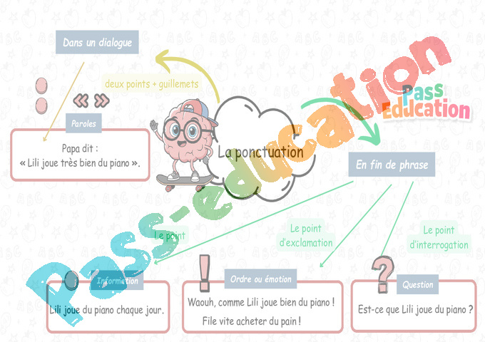 Cette carte mentale va permettre à l’aide de mots clés et d’associations d’idées d’avoir une vision synthétique sur la notion à mémoriser “La ponctuation”.