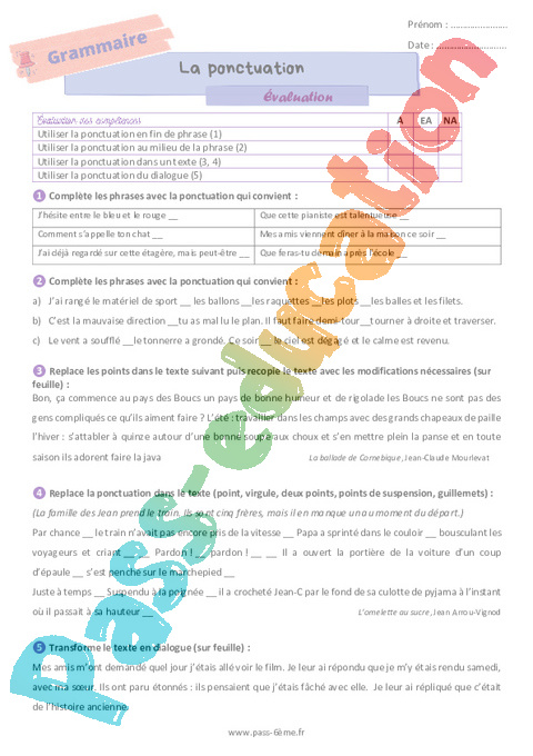 La ponctuation – Evaluation de grammaire pour la 6eme Primaire pdf