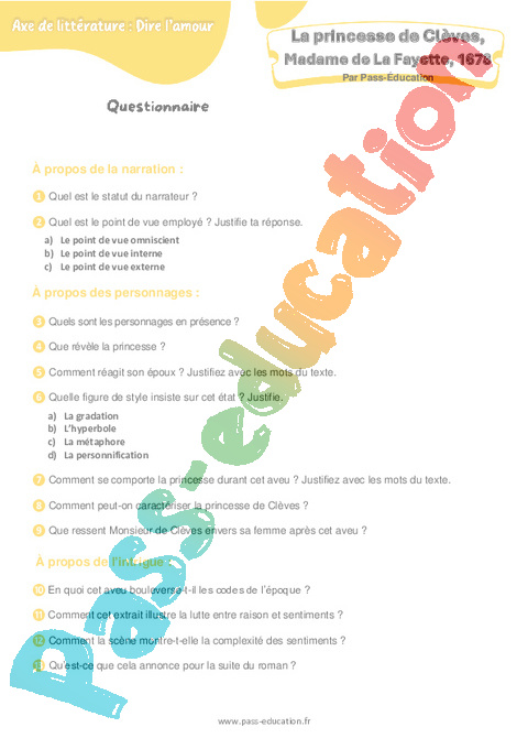 Questionnaire La Princesse de Clèves (Madame de La Fayette) : 2eme Secondaire pdf