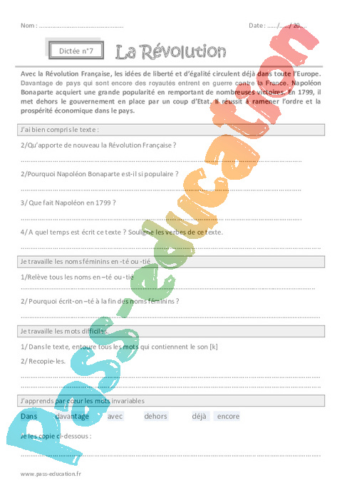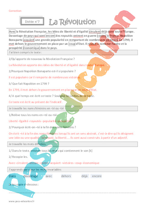 Correction La Révolution – Noms féminins en -té ou -tié : 4eme Primaire – Dictée accompagnée n°7 pdf