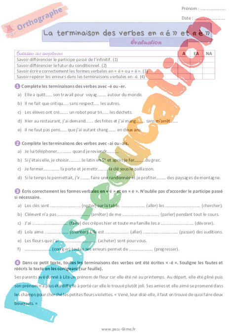 Evaluation 6ème La terminaison des verbes en [é] et [è] pdf