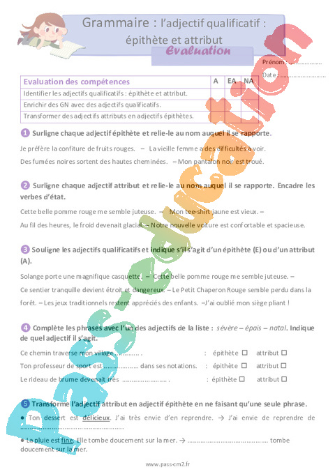 Correction Evaluation : 5eme Primaire l’adjectif qualificatif épithète et attribut pdf
