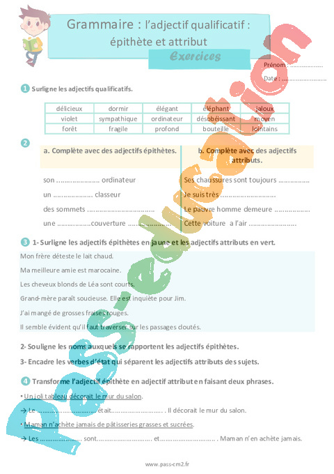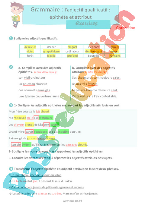 Correction Exercices : 5eme Primaire l’adjectif qualificatif épithète et attribut pdf