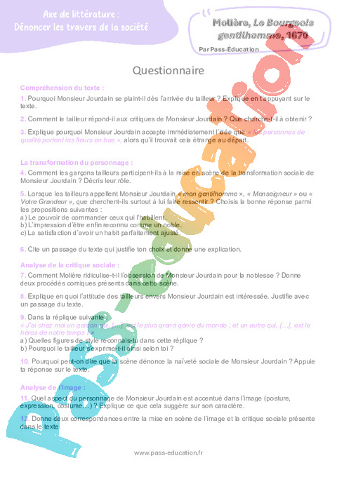 Questionnaire Le Bourgeois gentilhomme (Molière) : 3eme Secondaire pdf