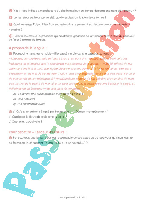 Correction Questionnaire Le chat noir, Edgar Allan Poe,1843 : 2eme Secondaire pdf