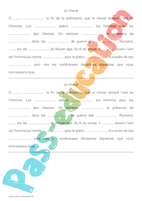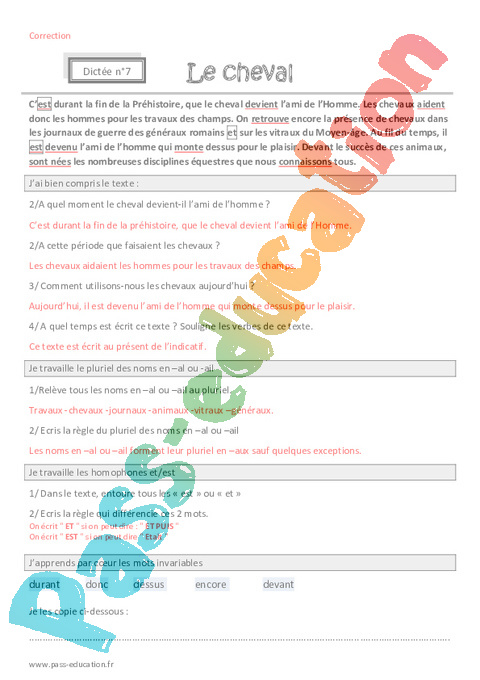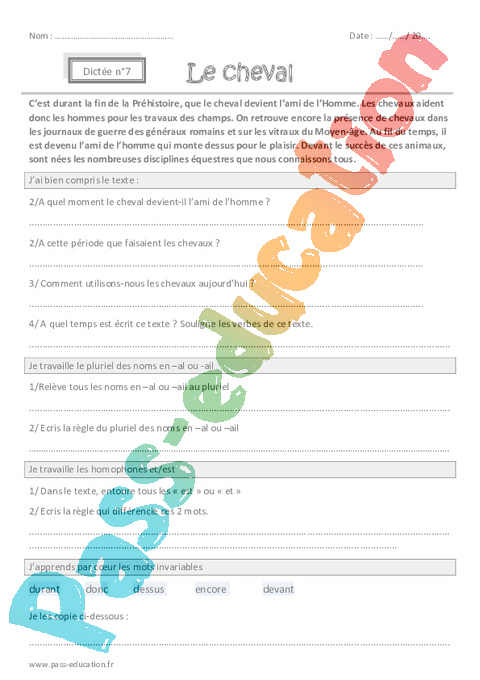 Le cheval – Noms en -al ou -ail – Homophones et – est : 4eme Primaire – Dictée accompagnée n°8 rtf