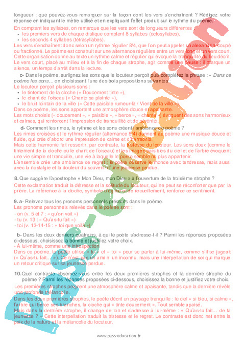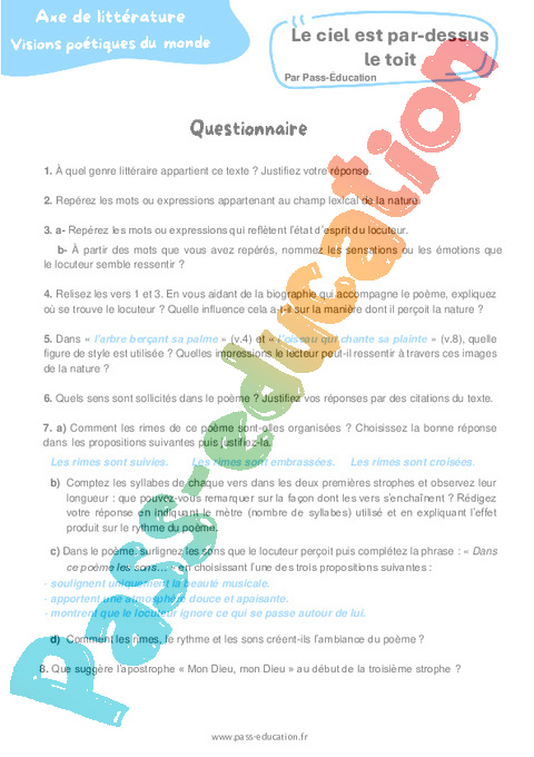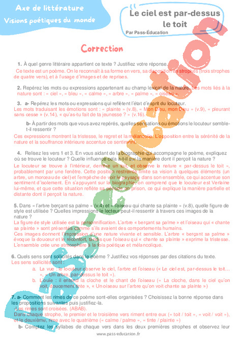 Correction Questionnaire Le ciel est par-dessus le toit (Paul Verlaine) : 3eme Secondaire pdf