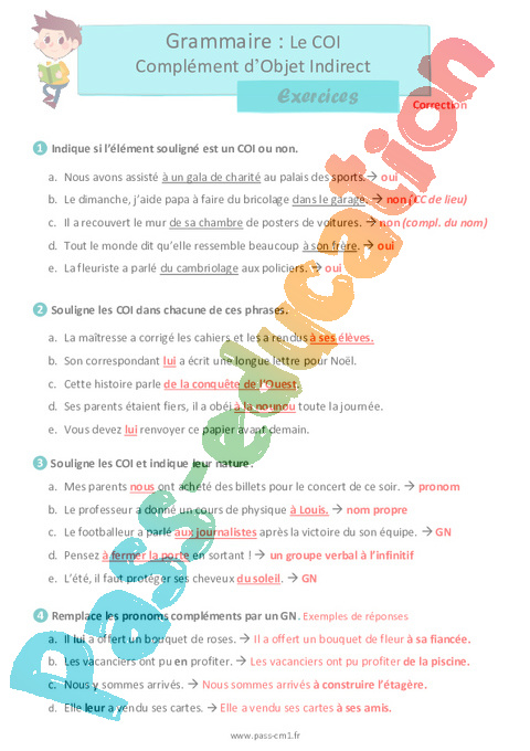Correction Le COI complément d’objet indirect – Exercices de grammaire pour la 4eme Primaire rtf