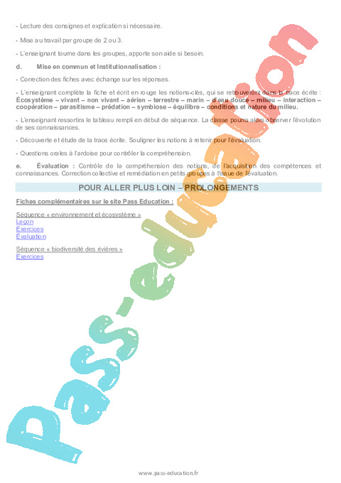 – L’enseignant complète la fiche et écrit en rouge les notions-clés, qui se retrouveront dans la trace écrite : Écosystème – vivant – non vivant – aérien – terrestre – marin – d’eau douce – milieu – interaction – coopération – parasitisme – prédation – symbiose – équilibre – conditions et nature du milieu.