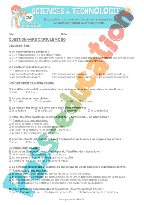 3 QCM capsule vidéo Le fonctionnement d’un écosystème : 4eme Primaire pdf