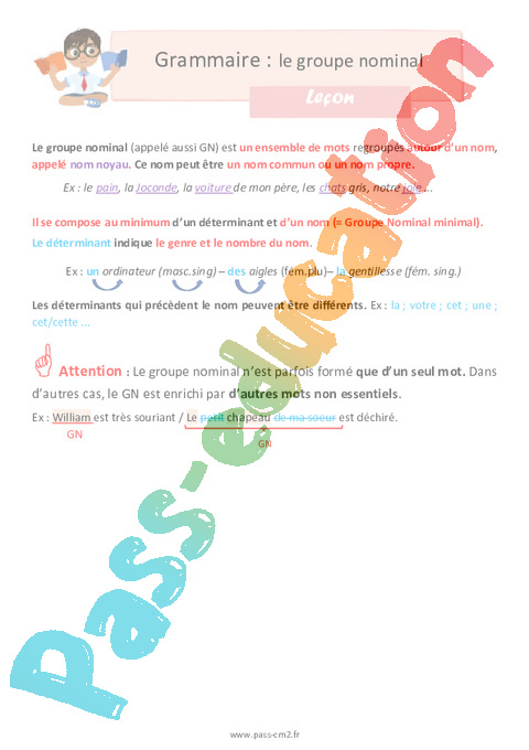 Le groupe nominal (appelé aussi GN) est un ensemble de mots regroupés autour d’un nom, appelé nom noyau. Ce nom peut être un nom commun ou un nom propre.