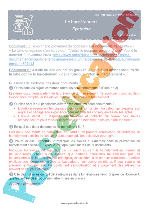 Synthèse Le harcèlement : 2eme Secondaire pdf