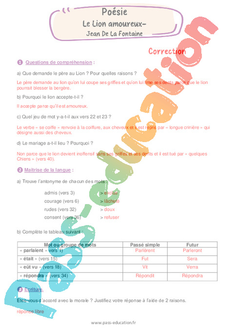 Correction Lecture poésie + Questionnaire Le Lion amoureux : 6eme Primaire pdf