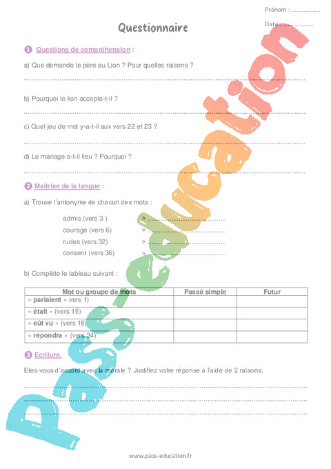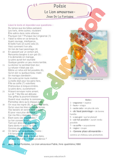 Lecture poésie + Questionnaire Le Lion amoureux : 6eme Primaire pdf