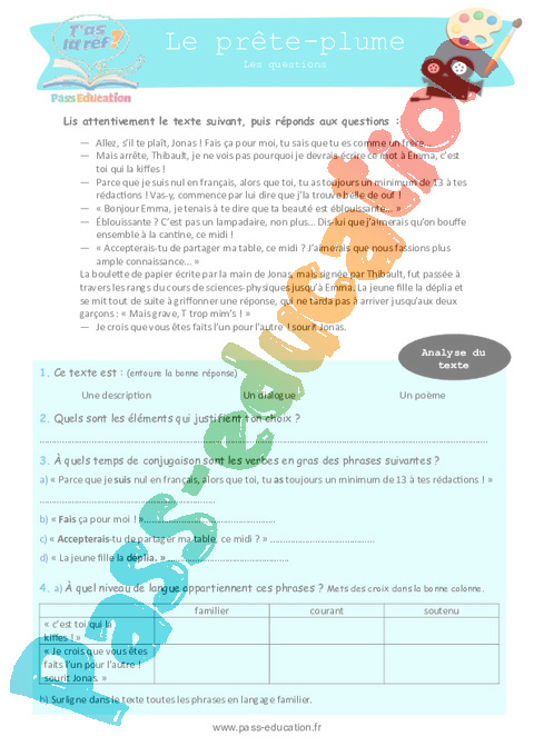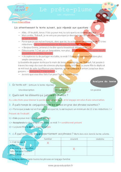 Correction Le prête-plume : 6eme Primaire 1ere Secondaire – Littérature – T’as la réf pdf