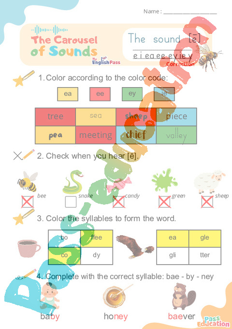 Correction Le son [ē] e i ea ee ey ie y – Phonologie anglaise – Carousel of Sounds – Fiche pdf