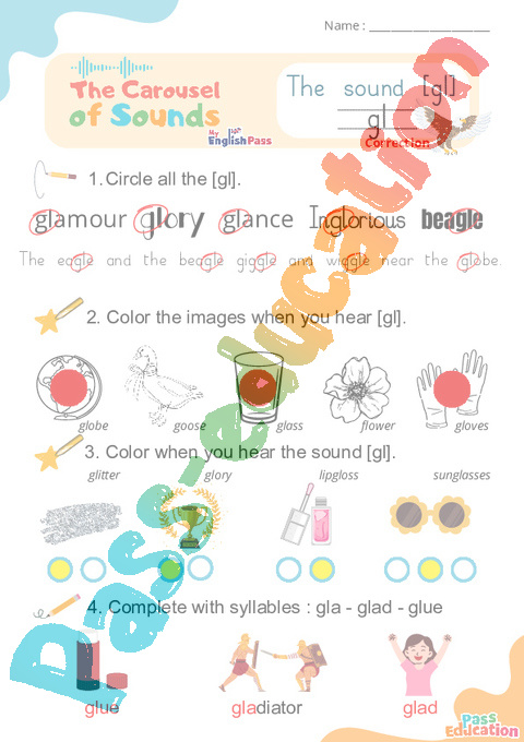 Correction [gl] gl – Phonologie anglaise – Carousel of Sounds – Fiche pdf