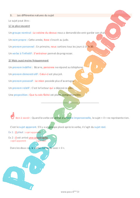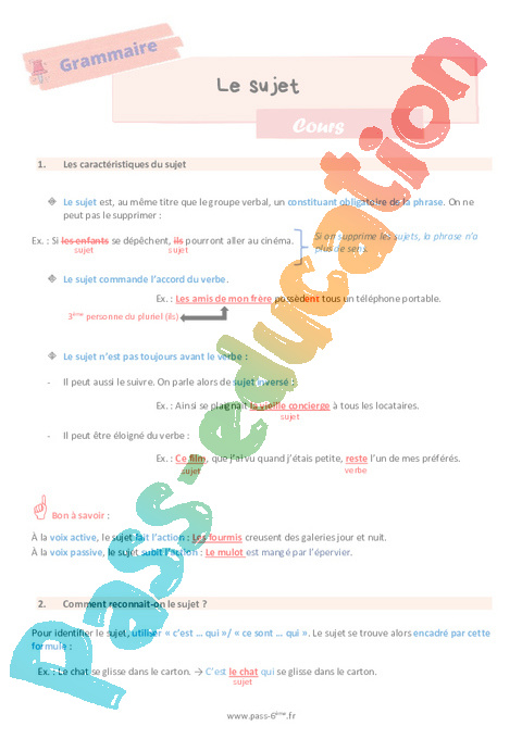 Cours de grammaire sur le sujet en 6ème.