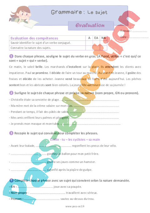 Évaluation de grammaire pour la 3eme Primaire sur le sujet.