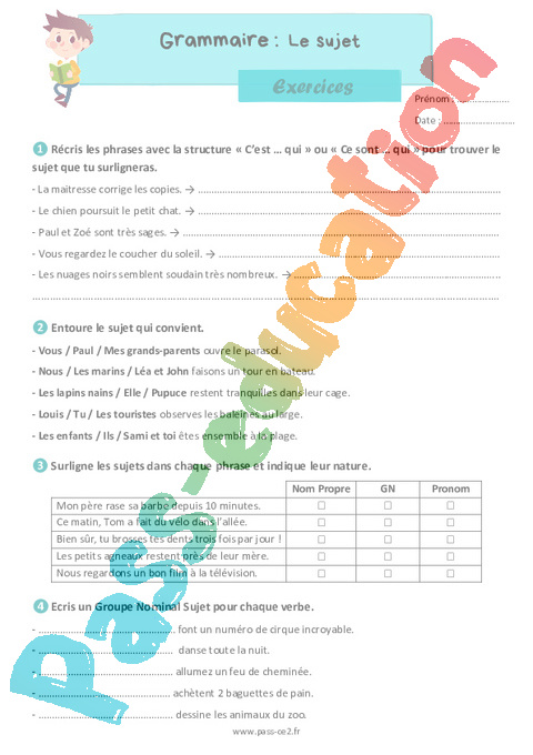 Exercices de grammaire pour la 3eme Primaire sur le sujet.