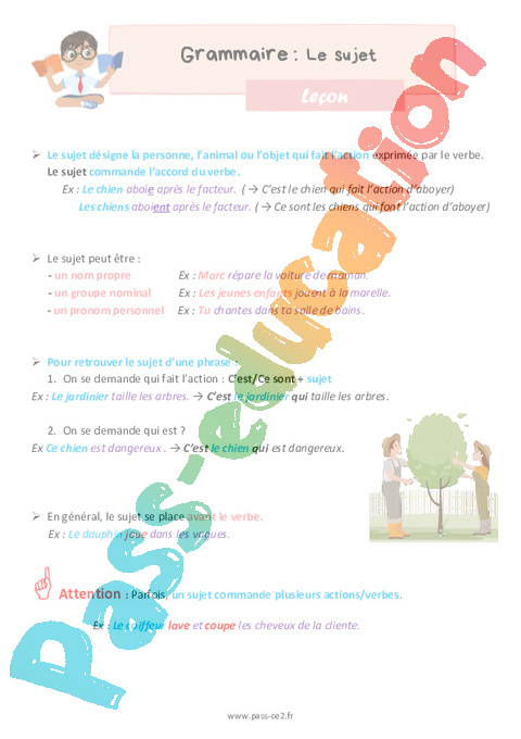 - Le sujet désigne la personne, l’animal ou l’objet qui fait l’action exprimée par le verbe.