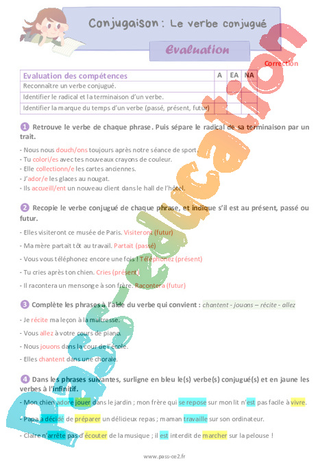 Correction Evaluation Le verbe conjugué : 3eme Primaire pdf