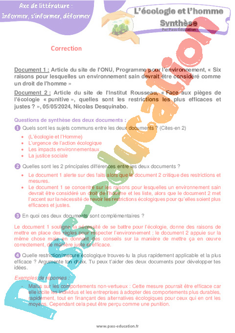 Correction Littérature L’écologie et l’Homme : 2eme Secondaire Synthèse pdf