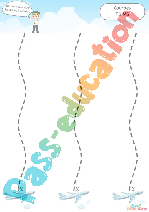 Les avions (les lignes courbes) – S’entraîner à découper pour mieux maîtriser le geste graphique, un premier pas vers l’écriture en : 1ere, 2eme Maternelle .