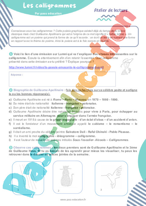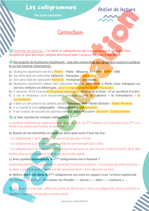 Correction Questionnaire Les calligrammes : 6eme Primaire rtf