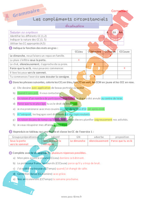 Évaluation de grammaire avec la correction sur les compléments circonstanciels en 6ème.