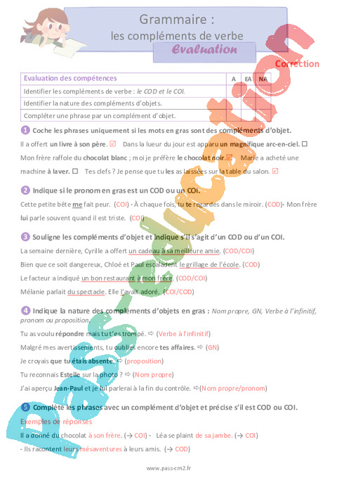 Correction Evaluation Les compléments de verbe (COD, le COI): 5eme Primaire pdf