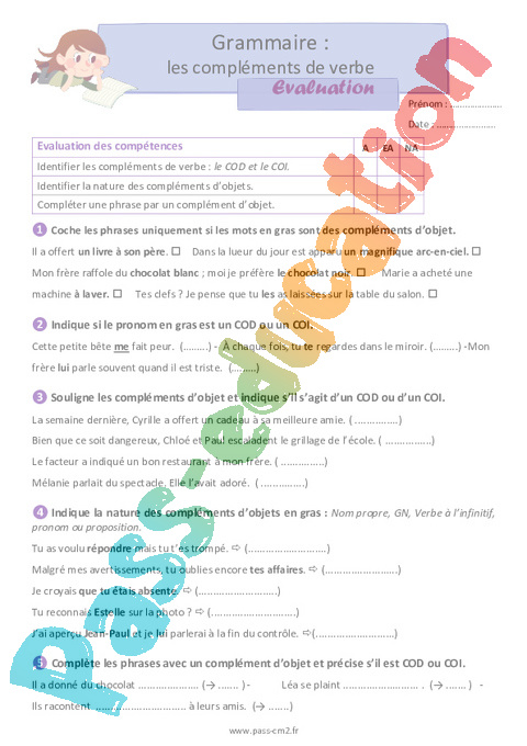 Évaluation de grammaire avec la correction sur les compléments de verbe (COD, le COI) : 5eme Primaire .