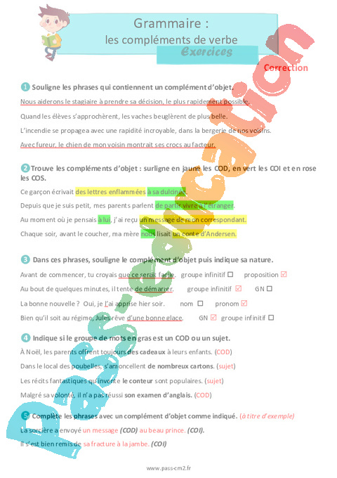 Correction Exercices Les compléments de verbe (COD, le COI): 5eme Primaire pdf