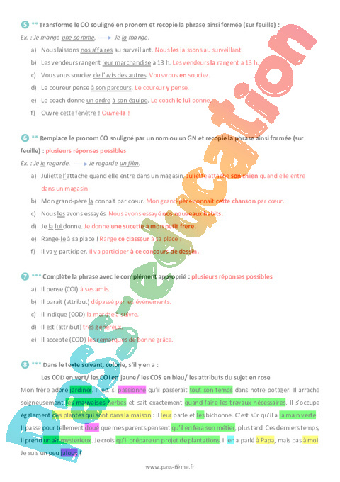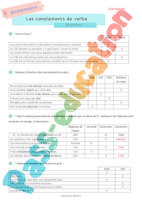 Correction Les compléments de verbe – Exercices de grammaire pour la 6eme Primaire pdf