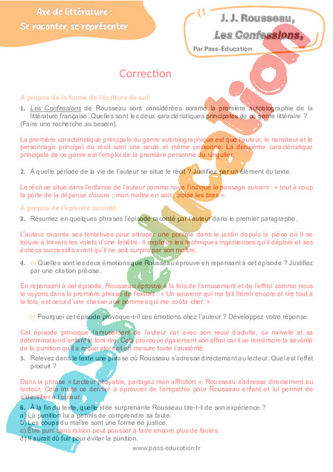 Correction Questionnaire Les Confessions (J. J. Rousseau) : 3eme Secondaire pdf