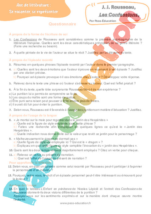 Questionnaire Les Confessions (J. J. Rousseau) : 3eme Secondaire pdf
