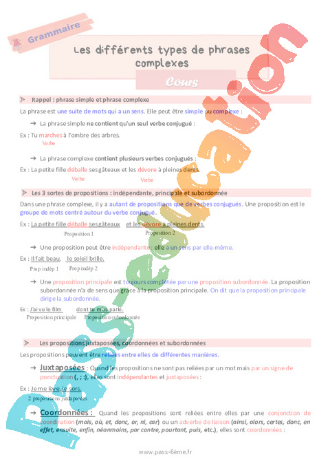 Cours de grammaire sur les différents types de phrases complexes en 6ème.