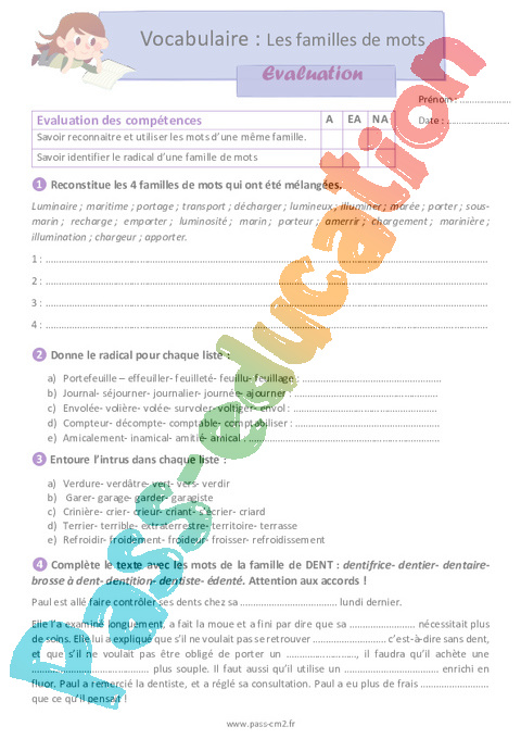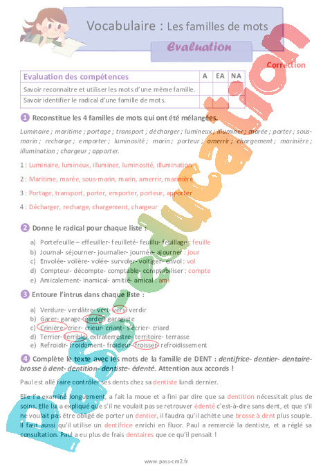 Évaluation avec la correction sur les familles de mots en 5eme Primaire .