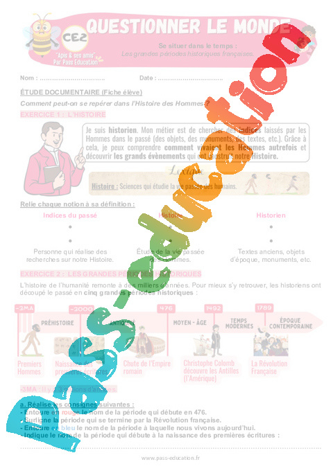 Exercices – Les grandes périodes historiques françaises en 3eme Primaire – Apis & ses amis : Questionner le monde.