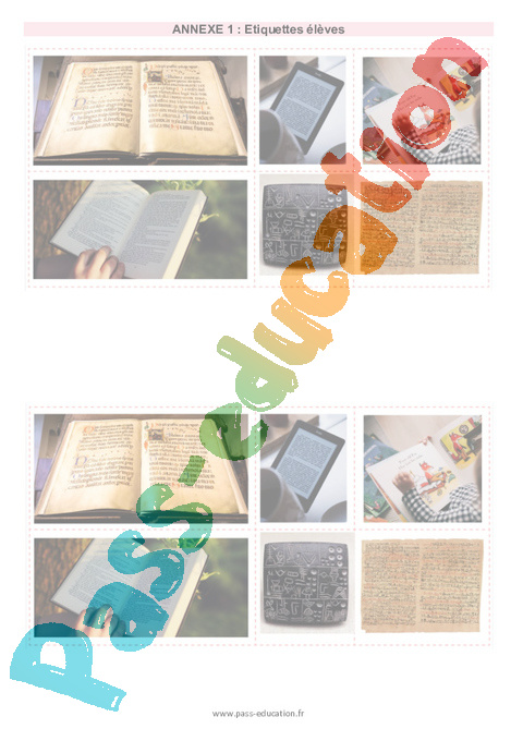 | – « Voici quelques images. Ensemble, nous allons nommer ce que nous y voyons. » L’enseignant présente une à une les images en grand format qu’il accroche au fur et à mesure au tableau. – « Par deux, vous allez maintenant trier ces images en deux groupes : imaginez que vous devez les répartir dans deux sacs différents. Réfléchissez bien à quelles images vous pouvez mettre ensemble. » L’enseignant fait référence aux deux colonnes tracées au tableau, avec les images aimantées au-dessous. Les élèves disposent des reproductions de ces images en petit format, et devront les disposer d’un côté ou de l’autre de leur table. L’enseignant passe dans les rangs pour aider, favoriser l’échange entre les deux élèves, si nécessaire. | -Confrontation des classements réalisés par les élèves, l’enseignant assure l’échange oral entre les apprenants. Il prend en considération le travail des élèves et rebondit sur leurs réponses pour les amener au tri attendu. – Si aucun tri évoqué par les élèves ne correspond aux attentes, l’enseignant peut alors proposer son tri : « Vous avez fini de ranger toutes ces images. Je vais maintenant vous proposer mon propre tri, regardez. » L’enseignant dispose alors les images représentant les supports d’écriture anciens (manuscrit, tablette en pierre, papyrus) dans la première colonne et ceux récents dans la deuxième ( deux livres imprimés et un livre numérique). – Pour nommer les colonnes, l’enseignant cherche à amener petit à petit les élèves à proposer du lexique qui peut s’approcher des réponses possibles : Il note tout ce que proposent les élèves dans chaque colonne. La vidéo qui suit permet d’amener une réponse à cette question et de nommer la colonne avec certitude. Pour introduire la suite de l’apprentissage sur les périodes historiques, l’enseignant pointe deux monuments anciens : – A votre avis « Lequel serait le plus ancien ? Comment pourrions-nous le savoir ? » (Tablette en pierre mésopotamienne vers -3000). |
