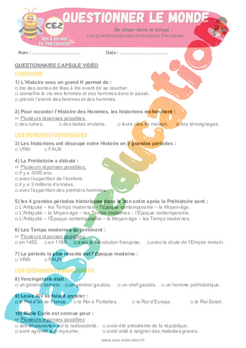 3 QCM capsule vidéo : 3eme Primaire Les grandes périodes historiques françaises pdf