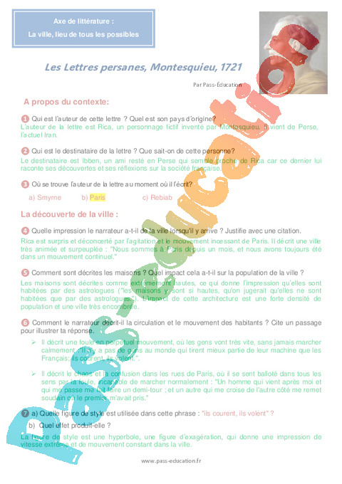 Correction Questionnaire Les Lettres persanes, Montesquieu, 1721 : 2eme Secondaire rtf
