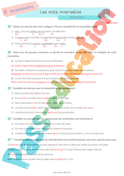 Exercices de grammaire avec la correction sur les mots invariables en 6ème.