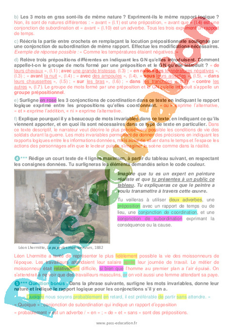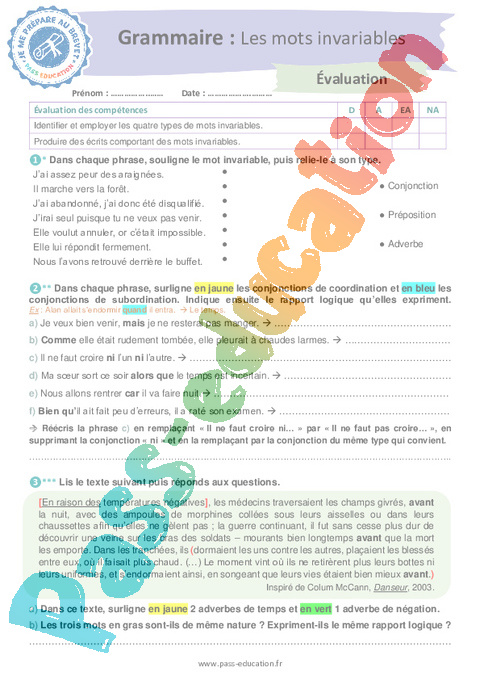 Correction Evaluation Les mots invariables : 3eme Secondaire pdf