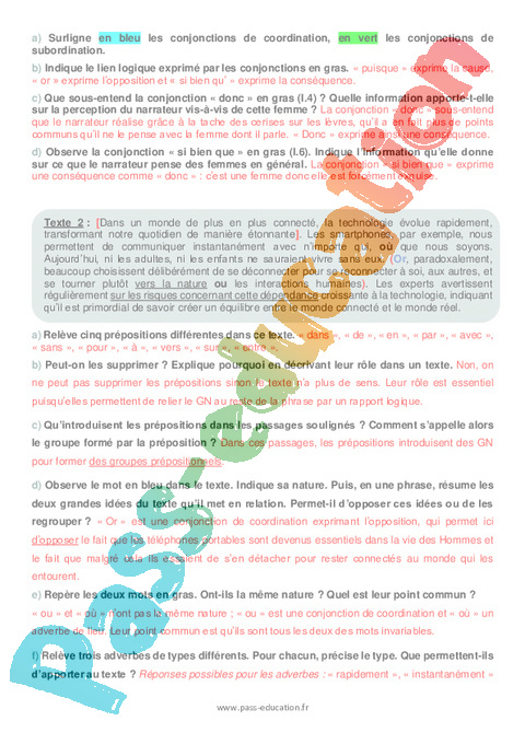 Texte 2 : [Dans un monde de plus en plus connecté, la technologie évolue rapidement, transformant notre quotidien de manière étonnante]. Les smartphones, par exemple, nous permettent de communiquer instantanément avec n’importe qui, où que nous soyons. Aujourd’hui, ni les adultes, ni les enfants ne sauraient vivre sans eux. (Or, paradoxalement, beaucoup choisissent délibérément de se déconnecter pour se reconnecter à soi, aux autres, et se tourner plutôt vers la nature ou les interactions humaines). Les experts avertissent régulièrement sur les risques concernant cette dépendance croissante à la technologie, indiquant qu’il est primordial de savoir créer un équilibre entre le monde connecté et le monde réel.