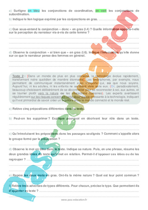 Complète le texte suivant avec le type de mot invariable et le rapport demandés.