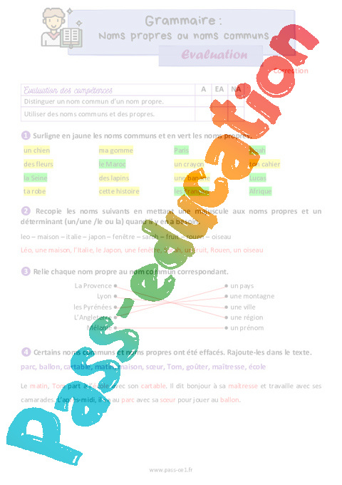 Correction Evaluation Les noms communs et noms propres : 2eme Primaire pdf